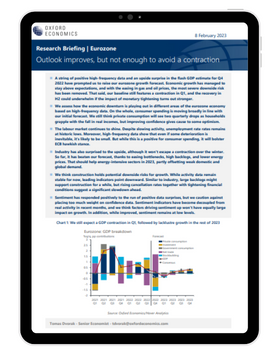 A string of positive high-frequency data and an upside surprise in the flash GDP estimate for Q4 2022 have prompted us to raise our eurozone growth forecast. Economic growth has managed to stay above expectations, and with the easing in gas and oil prices, the most severe downside risk has been removed. That said, our baseline still features a contraction in Q1, and the recovery in H2 could underwhelm if the impact of monetary tightening turns out stronger.