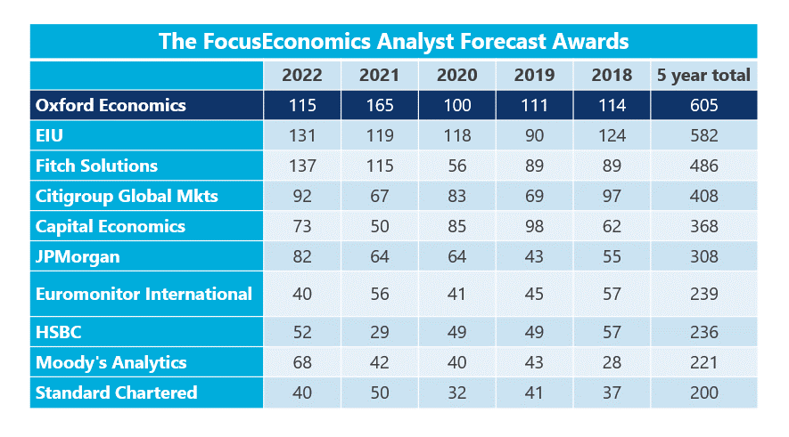 Oxford Economics is proud to announce that we have been, once again, recognised as one of the top performers in this year’s FocusEconomics’ Analyst Forecast Awards, securing 39 first place rankings and a total of 115 awards.
