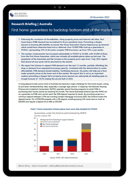 - We expect the Scheme to support FHB demand over the next 12 months, partially offsetting the drag on demand from squeezed borrowing capacity. Combined with the deterioration in rental affordability, FHB demand should stabilise. Facilitating turnover, the policy will help put a floor under property prices at the lower end of the market. We expect this to act as an important cushion preventing a steeper fall in property prices beyond our nationwide all-dwelling peak-to-trough forecast of -10.5% ending the second half of 2023.