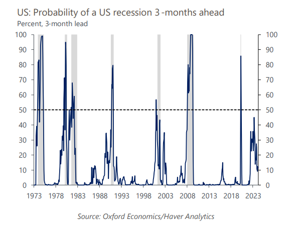 - While the sentiment-based and macro indicators we identified provide a strong fit in proceeding recessions dating back to 1973, their signal is limited to the six- or nine-month horizons, depending on the indicator. This contrasts with the signal from the yield curve model, which improves as the horizon increases. Our three- and six-month models show recession risks are at their lowest levels since the two consecutive quarters of negative growth in 2022.