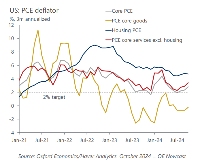 Our nowcast suggests October’s headline and core PCE inflation will be at their fastest monthly pace in six months and above the Fed’s most recent forecasts. The renewed upside risks to inflation from tariffs and looser fiscal policy mean the Fed may opt for a slower pace of rate cuts.