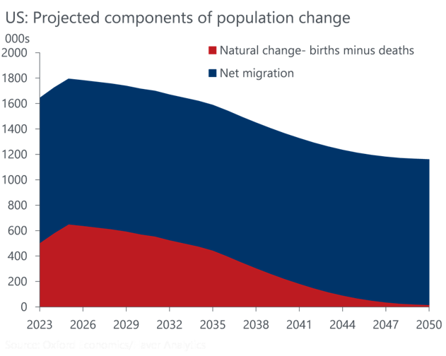 Contemplating a higher pace of immigration may seem unrealistic in the current political climate, as a surge of immigrants is straining government resources in many areas. However, the economic consequences of the demographic shift in the US—characterised by lower births rates, slower net migration and higher death rates—are significant and will require policymakers to eventually adopt a balanced and forward-thinking approach to immigration policy.