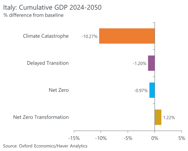 - The two Net Zero scenarios assume the immediate implementation of aggressive mitigation policies, limiting global warming, and reaching net zero in 2050. In addition, the Net Zero Transformation scenario explores an upside situation thanks to measures aimed at stimulating green investments and innovation.