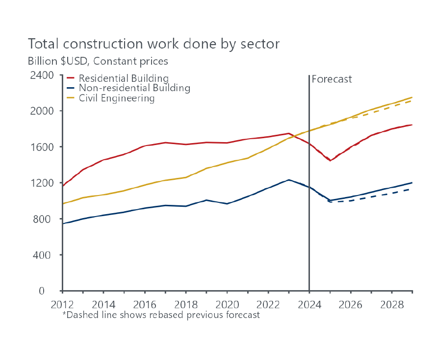 世界の建設活動は2025年に一時的に減少しますが、2027~2029年には回復し、年平均2.7%の成長が見込まれます。アジアでは2025年に5.6%落ち込むものの、中期的には年3.6%の成長へと転じ、堅調な拡大が続くと予測しています。