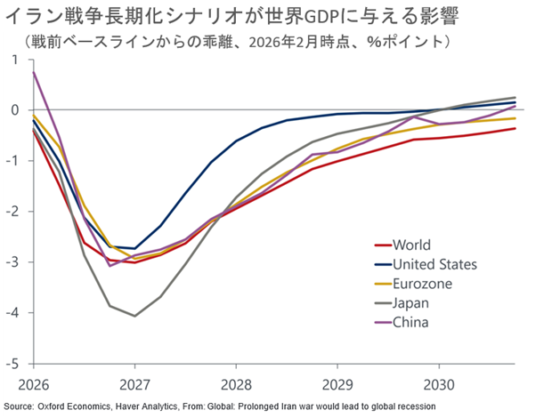 価格上昇の規模は大きな非線形性を引き起こし、経済への影響を増幅させる結果、2026年半ばには世界経済活動が縮小するという、稀にみる局面が想定されます。