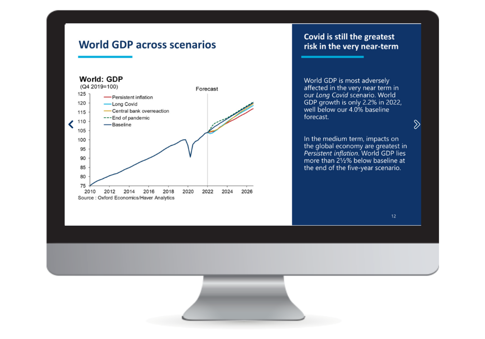 当社独自のグローバル経済モデルを用いて、主要なリスクが世界経済に及ぼす影響を分析します。リスクが発生した場合、ベースライン予測(例:GDP、消費、金利)がどの程度上振れまたは下振れするのかをシミュレーション。各リスクシナリオの特徴とベースライン予測および向こう5年間の見通しを示したレポートとデータセットを提供。