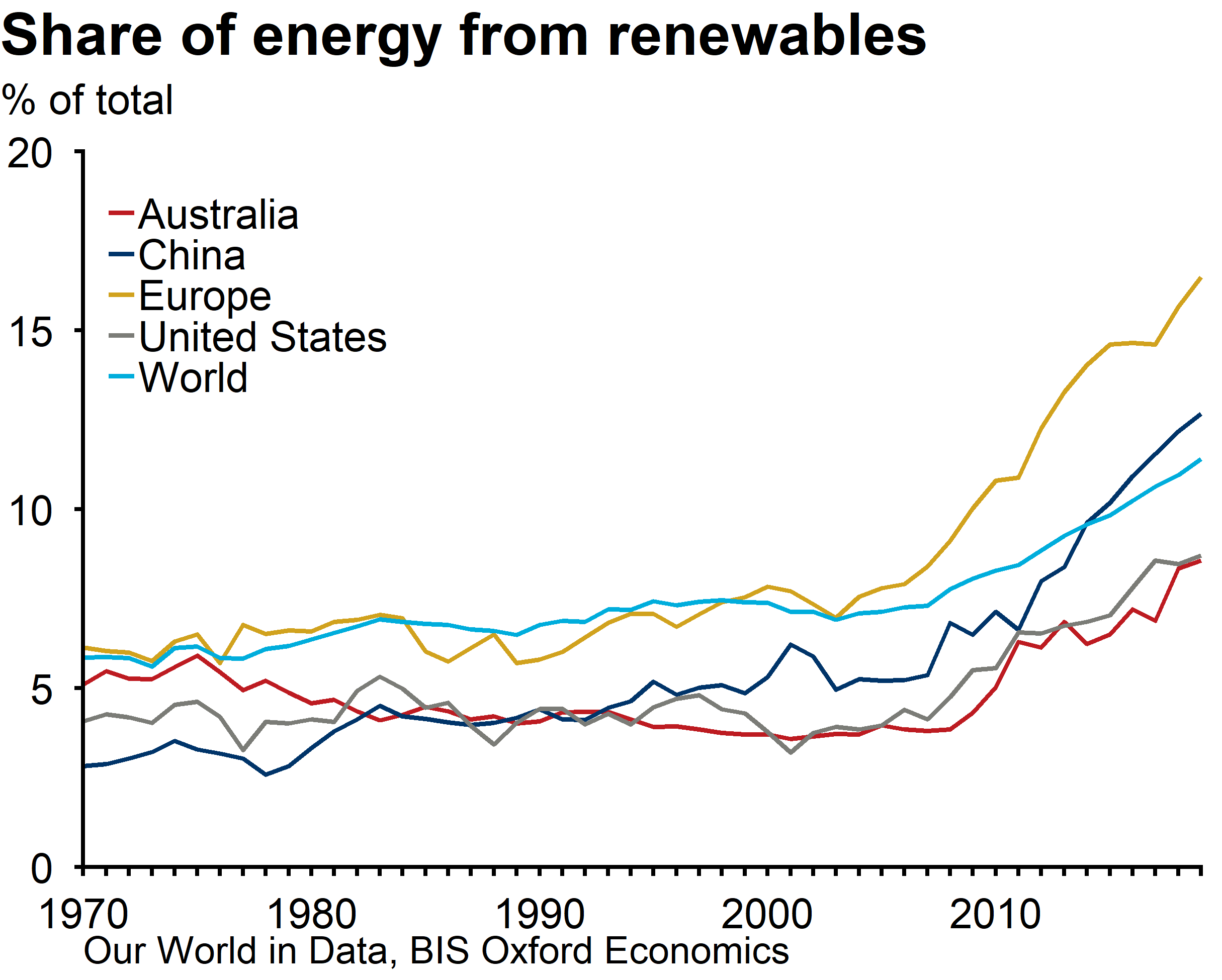 Energy generation and distribution will be key to reaching any new commitments. Renewable energy investment has ramped up over the past decade, with 8.6% of Australia’s energy coming from renewables in 2019. But despite its comparative advantages in renewable energy generation, Australia’s renewables share is well below the global average of 11.4%. And it’s not just developed economies that lead Australia: China’s share of energy from renewables has jumped to 12.7%.
