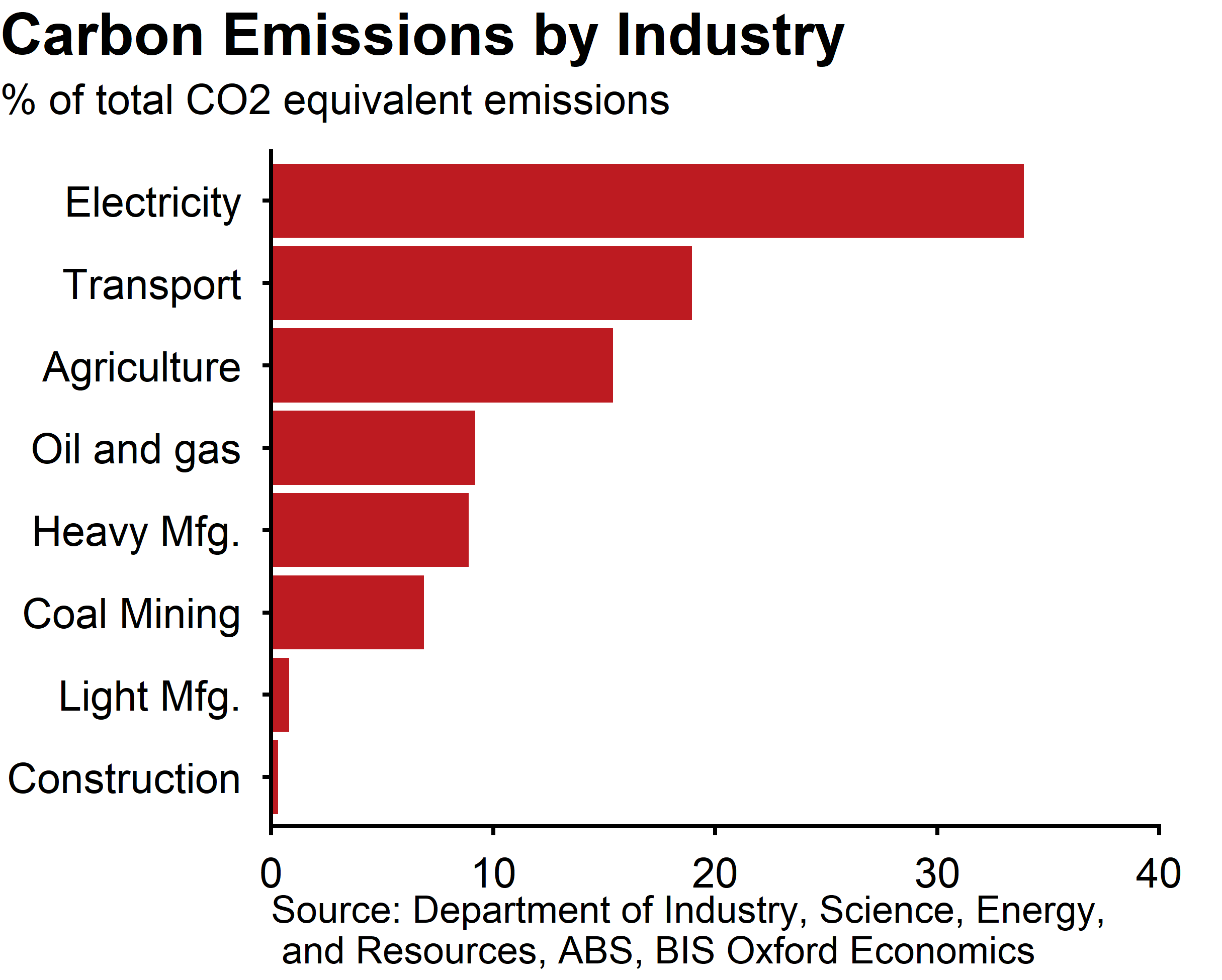 greenereconomyimage2Shifting to a lower emissions target will weigh on GDP growth in the near term, given the economy’s weak starting point and the mining sector’s share of output. However, the hit to GDP will be smaller the sooner the target goal of net zero by 2050 is adopted. We expect the shift in government policy will be gradual, preventing a sharp decline in output and supporting affected industries. But there are upside opportunities from a shift to a greener economy domestically and abroad. With ready access to hydro, solar, and wind resources, Australia is well positioned to become a net exporter of clean energy; plus, green hydrogen export projects are already in the works.