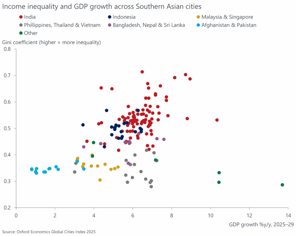 Over the past century, Southern Asian economies have emerged from colonial rule, navigated conflict and political instability, and are now beginning to reap the benefits of their independence. Yet, as is typical with the emerging stage of economic development, this volatility and fast growth has made space for inequality between and within local regions and cities. Addressing these disparities is essential to sustaining progress. Without meaningful action, inequality risks undermining development by limiting access to opportunity and enabling corruption. By harnessing their strengths and working on their weaknesses, Southern Asian cities can continue on their path of becoming major global powerhouses.