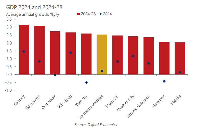 Overall, the medium-term outlook for Canadian metros is strong in terms of total GDP, with the country’s 10 major metros averaging 2.6% growth per year to 2028, outperforming the national average. However, five-year growth rates mask a more turbulent story in most metros. Growth in 2024 will be much slower as the current recession plays out. In contrast nearly every metro will see GDP growth surge in 2025 and 2026, before settling to a longer-term equilibrium by 2028.