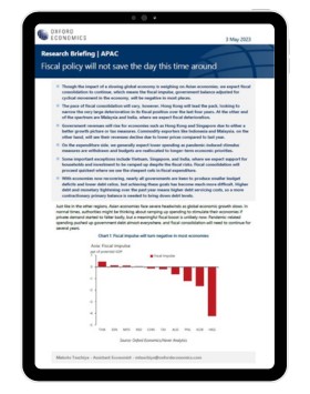 - The pace of fiscal consolidation will vary, however. Hong Kong will lead the pack, looking to narrow the very large deterioration in its fiscal position over the last four years. At the other end of the spectrum are Malaysia and India, where we expect fiscal deterioration.