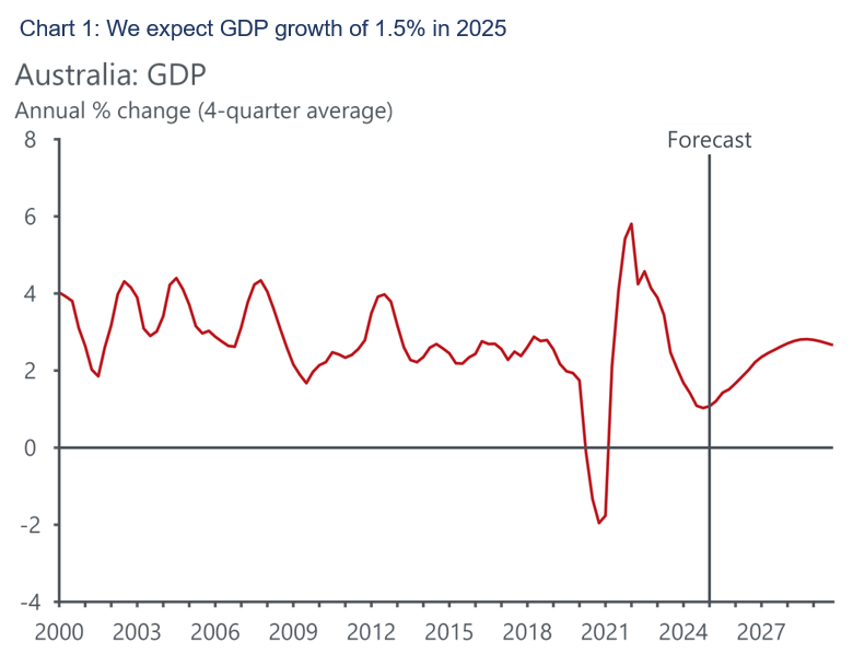 Australia’s growth has stalled and the outlook has dimmed. The economy crawled in early 2025, growing just 0.2% q/q in Q1. And there’s little evidence it will get out of its funk quickly. We now expect GDP growth of just 1.5% in 2025, down from our 1.8% forecast in May.