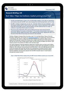 The BoE raised Bank Rate by 75bps to 3% at its November meeting, in line with our expectations and market pricing. But the MPC sent a clear message that market pricing further out is too high.