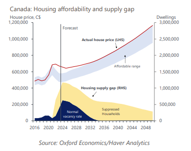• Moreover, we have key concerns regarding such a massive potential addition to Canada’s housing supply. It would result in about 1 in 5 dwellings being unoccupied, raising the risk of an over-supplied housing market and a prolonged house price slump, especially as aging baby boomers begin selling or bestowing their homes in the mid-to-late 2030s.