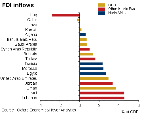 Countries that have typically placed an emphasis on FDI—the UAE, Qatar (despite a recent period of divestment), and Bahrain—stand in a good position competitively. The advantages of Saudi Arabia are clear, and if improvements to its business environment continue to be made and Vision 2030 is successfully implemented, then Saudi Arabia’s FDI attractiveness should rise, although its recent targets for FDI are extremely ambitious.