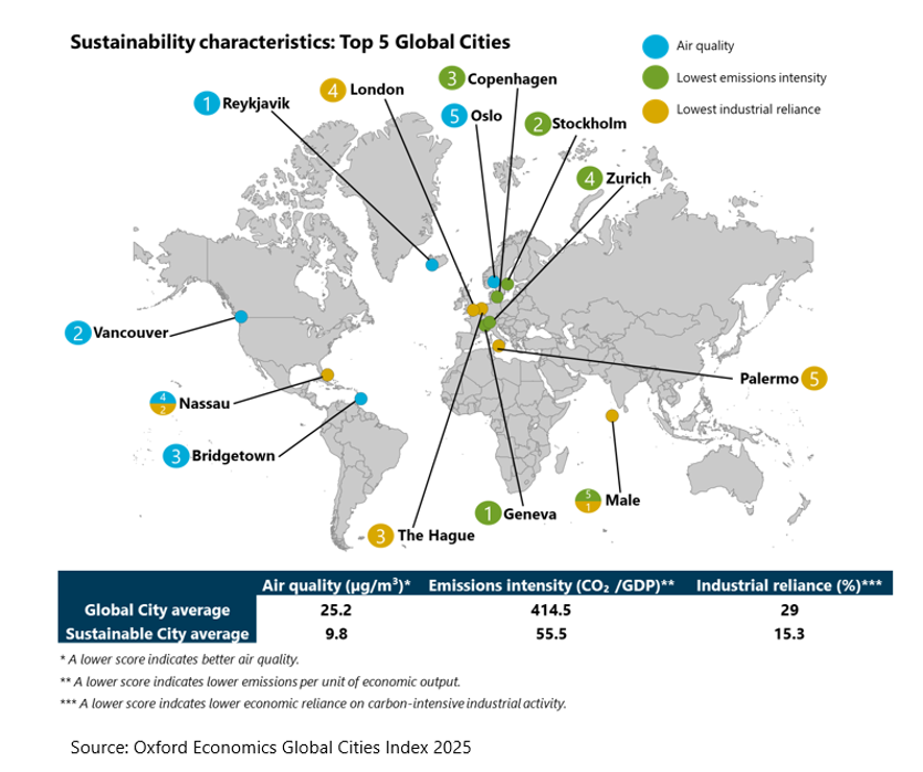 Against this backdrop, and despite sometimes significant rollbacks at the national level, many cities remain committed to climate and sustainability agendas. Our research identified 63 cities as Sustainable Cities, based on indicators such as air quality, emissions intensity, political stability, and economic reliance on carbon-intensive industries.