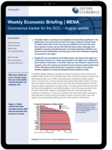 The Delta variant is causing concern globally and is becoming significant in the Middle East. It now accounts for most of the cases in Bahrain, Kuwait, Israel and Qatar (where data Covid-19 by type are published) and cases have also been reported in Oman and the UAE. With the Delta variant seemingly more resistant to vaccines (and effectiveness of vaccines seeming to diminish over time) and more transmissible, this may pose a risk to the continued re-opening of economies in the region.