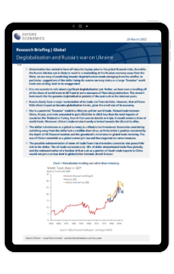 Globalisation has started to level off since its heyday prior to the global financial crisis. But while the Russia-Ukraine war is likely to result in a reorienting of the Russian economy away from the West, we are wary of predicting broader deglobalisation trends emerging from the conflict. In particular, suggestions of the dollar losing its reserve currency status or a large “Eurasian” world trade axis arising, look to be exaggerated.