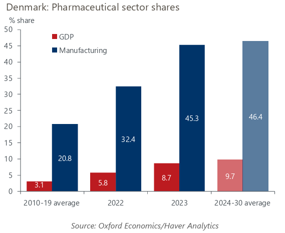 After several years of rapid growth, we think Denmark’s pharmaceutical sector has reached an inflection point and production will settle at a new permanent high. But US President Donald Trump’s threat to impose high tariffs on Danish goods over the status of Greenland means the pharma sector is entering a more uncertain and protectionist era.