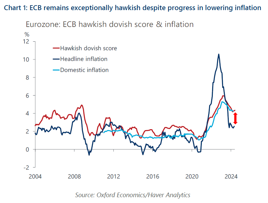 - Stickiness in wages and domestic inflation remain a key worry point. Leading indicators point to good news accumulating on that front, which we think will facilitate further rate cuts later this year. But we now think that progress won’t be fast enough to reduce the ECB’s hawkish tilt sufficiently. Therefore, we expect only two more rate cuts this year, in September and December.