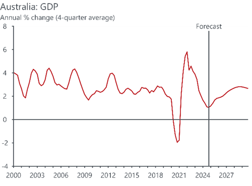 The past month has been relatively quiet compared to the flurry of activity following the ‘liberation day’ tariff announcements in the US. At the margin, Australia’s wage and inflation outcomes have been very slightly stronger than expected, but not by enough to alter the outlook for growth or monetary policy. Our GDP growth forecast for 2025 is unchanged at 1.8%, followed by 2.1% in 2026.