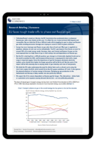 Following Russia’s attack on Ukraine, the EU Commission has accelerated plans to phaseout Russian gas, with a two-thirds cut this year. To offset the cut, it aims to boost LNG imports and renewables. But we think the EU faces difficult trade-offs in juggling its goal to phase out Russian gas while avoiding economic damage and staying on course to fulfil its green ambitions.