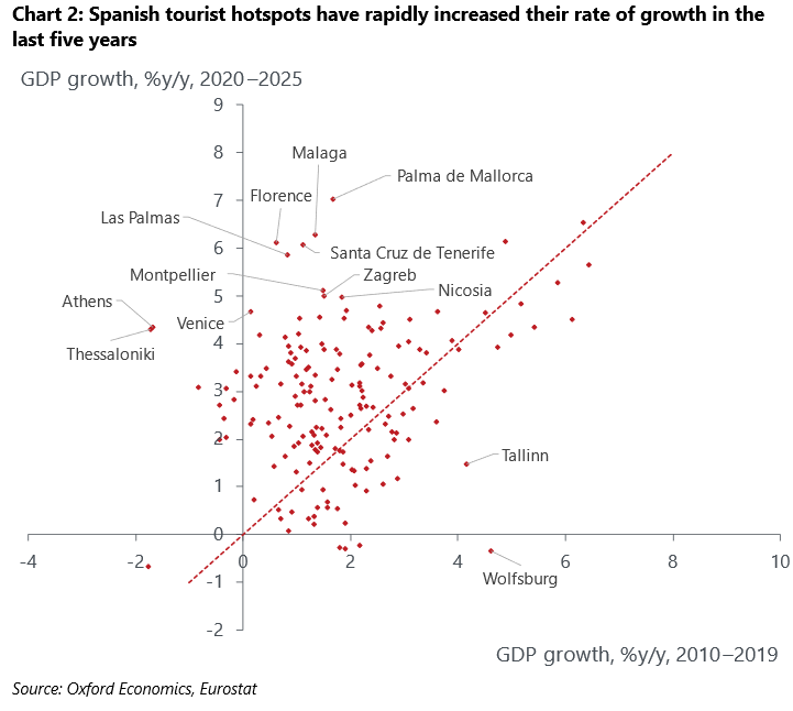 Many of Europe’s fastest growing cities have maintained their strong growth trajectories in recent years. But the strongest performing cities since Covid-19 are in Spain, with popular tourist hotspots such as Mallorca, Malaga, and Tenerife all experiencing a rapid change in growth rates. Each of these three cities has grown over 6% annually between 2020-2025—this is three times as fast as they had in the decade leading up to Covid-19.