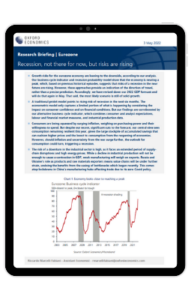 Growth risks for the eurozone economy are leaning to the downside, according to our analysis. Our business cycle indicator and recession probability model show that the economy is nearing a peak, which, based on previous historical episodes, suggests that risks of a recession in the near future are rising. However, these approaches provide an indication of the direction of travel, rather than a precise prediction. Accordingly, we have revised down our 2022 GDP forecast and will do that again in May. That said, the most likely scenario is still of solid growth.