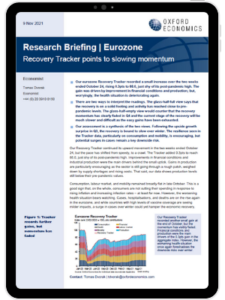 Our eurozone Recovery Tracker recorded a small increase over the two weeks ended October 24, rising 0.3pts to 88.0, just shy of its post-pandemic high. The gain was driven by improvement in financial conditions and production; but, worryingly, the health situation is deteriorating again.