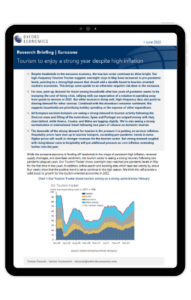 Despite headwinds to the eurozone economy, the tourism sector continues to shine bright. Our high-frequency Tourism Tracker suggests overnight stays in May have recovered to pre-pandemic levels, pointing to a strong high season that should add a sizeable boost to tourism-oriented southern economies. This brings some upside to an otherwise negative risk skew in the eurozone.