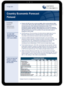 Finland’s Q2 GDP has been revised up slightly, which mechanically has lifted our forecast for 2021 growth. Most leading indicators remain buoyant but show slowing momentum as the initial post-reopening boom fades. Virus transmission remains contained, while industry has so far proved resilient to the global headwinds.