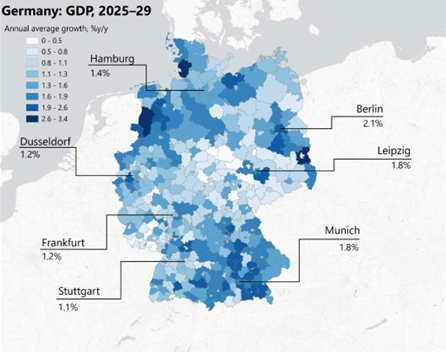 Additional US tariffs have led us to downgrade our short-term outlook for the German economy, with this impact mostly concentrated in southern regions of the country. In contrast, Germany’s large fiscal package to boost defence and infrastructure spending means that we now expect stronger growth over the medium term, with all regions set to benefit.