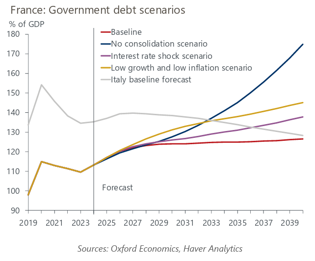 By 2035, we expect France’s public debt to approach 125% of GDP, up from 113% in 2024 and among the highest in advanced economies.