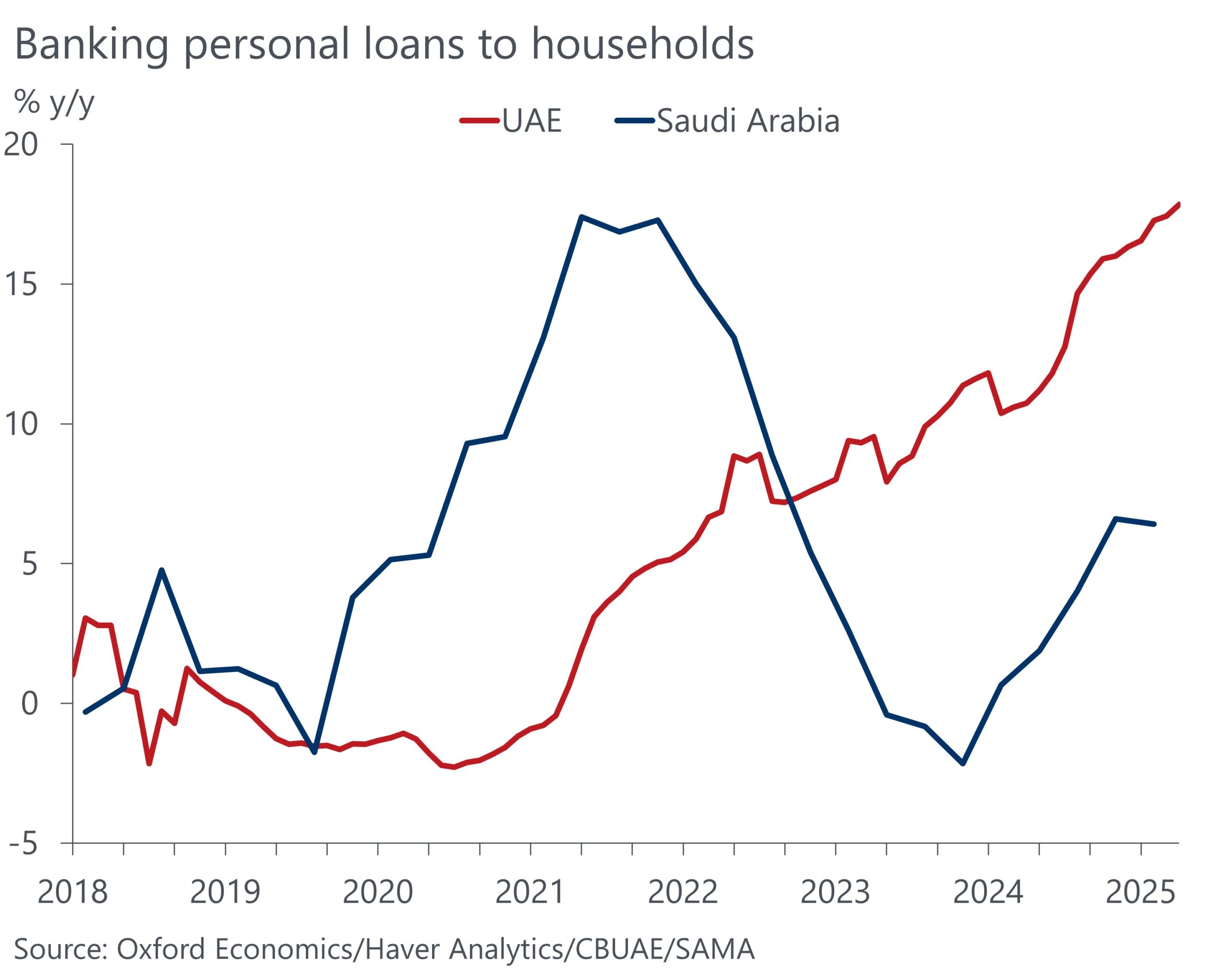 The UAE and Saudi Arabia exemplify this trend. Our recent research revealed that in Saudi Arabia, personal lending has rebounded following a dip in 2023 that succeeded pandemic-driven growth. Meanwhile, UAE private sector retail loans have surged over 50% since January 2022, sustaining double-digit growth since late 2023. This reflects a structural break from previous trends, propelled by relaxed lending standards for both nationals and expatriates.