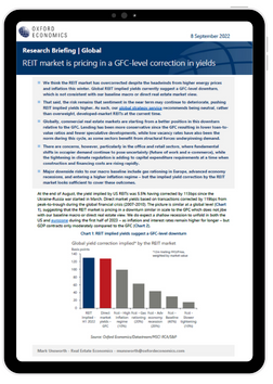 We think the REIT market has overcorrected despite the headwinds from higher energy prices and inflation this winter. Global REIT implied yields currently suggest a GFC-level downturn, which is not consistent with our baseline macro or direct real estate market view.