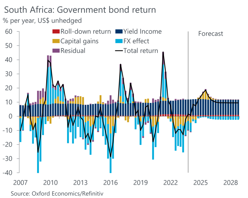 A decomposition into capital gains, yield income (coupon payments), and roll-down return shows that for many advanced economies (AEs) our upbeat return expectations are predicated on yields falling back from their current elevated levels. For emerging markets, structurally high interest rates provide a healthy cushion for returns, while the relative contribution from capital gains to total returns is generally more limited. But the rollercoaster of US rate expectations and a strong US dollar will continue to skew the risk-reward profile for investing in EMs.