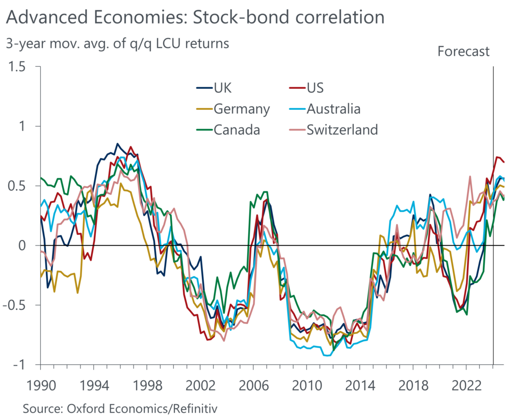 The striking commonality of the stock-bond correlation (SBC) across AEs can be explained by many of the factors affecting the SBC being determined as much by global development as by domestic ones. For example, the period following the Global Financial Crisis, during which the SBC was strongly negative, was characterised by low and stable inflation and interest rates, fiscal consolidation to repair public balance sheets, and an absence of large global supply shocks. These driving forces have all been upended in the aftermaths of the Covid-19 pandemic. In response, the SBC became strongly positive, reducing the hedging properties of government bonds and the risk-reward profile of a standard investment portfolio.