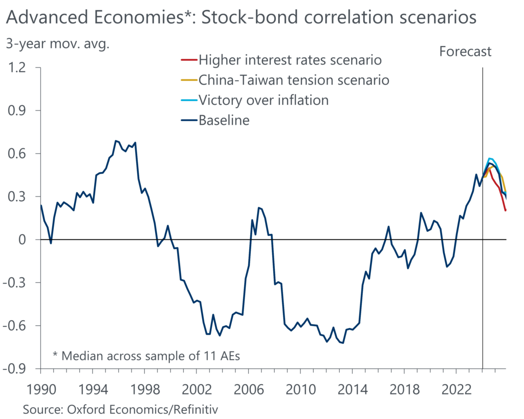 Indeed, when assessing the implied predictions for the SBC from our Global Economic Model across a range of alternative scenarios, we generally find little scope for a reversal to a negative correlation in the near term. This does not only hold true in our downside scenarios but also in our upside scenario, where inflation is brought under control faster than what we expect in our base case forecast. While a traditional investment portfolio would see higher returns than in the base case in this scenario, bonds would still not act as diversifiers.