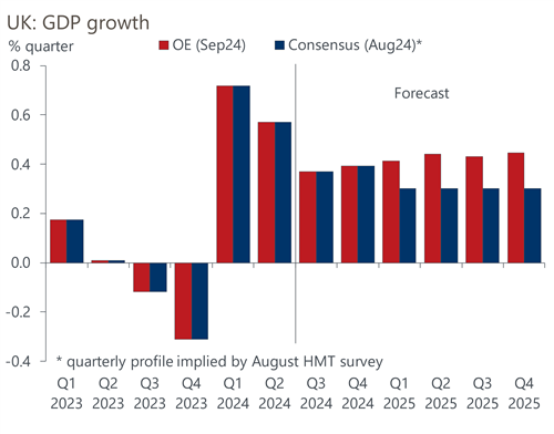 The UK grew at an above-trend pace in H1 2024, but we don’t expect this to be sustained over the next couple of years. However, we are more optimistic than the consensus. Our forecast that GDP will grow by 1.7% next year is based on the notion that consumers will finally shed their caution and make a stronger contribution to growth.