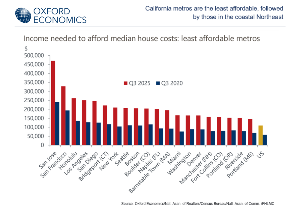 - The least affordable metros were San Jose, San Francisco, Honolulu, Los Angeles, and San Diego, where a maximum of 17% of households earned enough income to afford their respective housing costs in Q3 2025.
