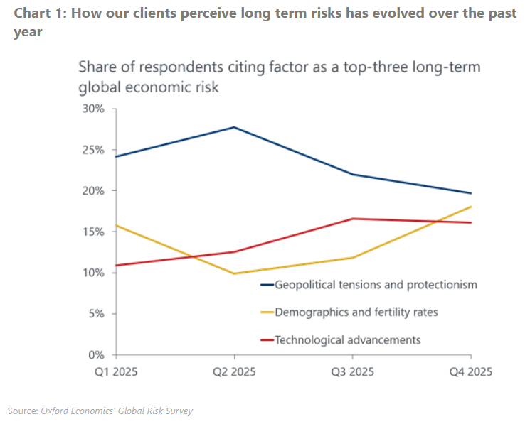 Trump’s ‘liberation day’ tariffs accelerated the retreat from globalisation. By Q2 2025, over one-third of businesses cited geopolitics and protectionism as the key long-term downside risk, prompting our baseline to move closer to our Fractured World scenario. The same America First shift also heightened client concern around institutional risk in Q4, which we assess in our Global Rebalance scenario.