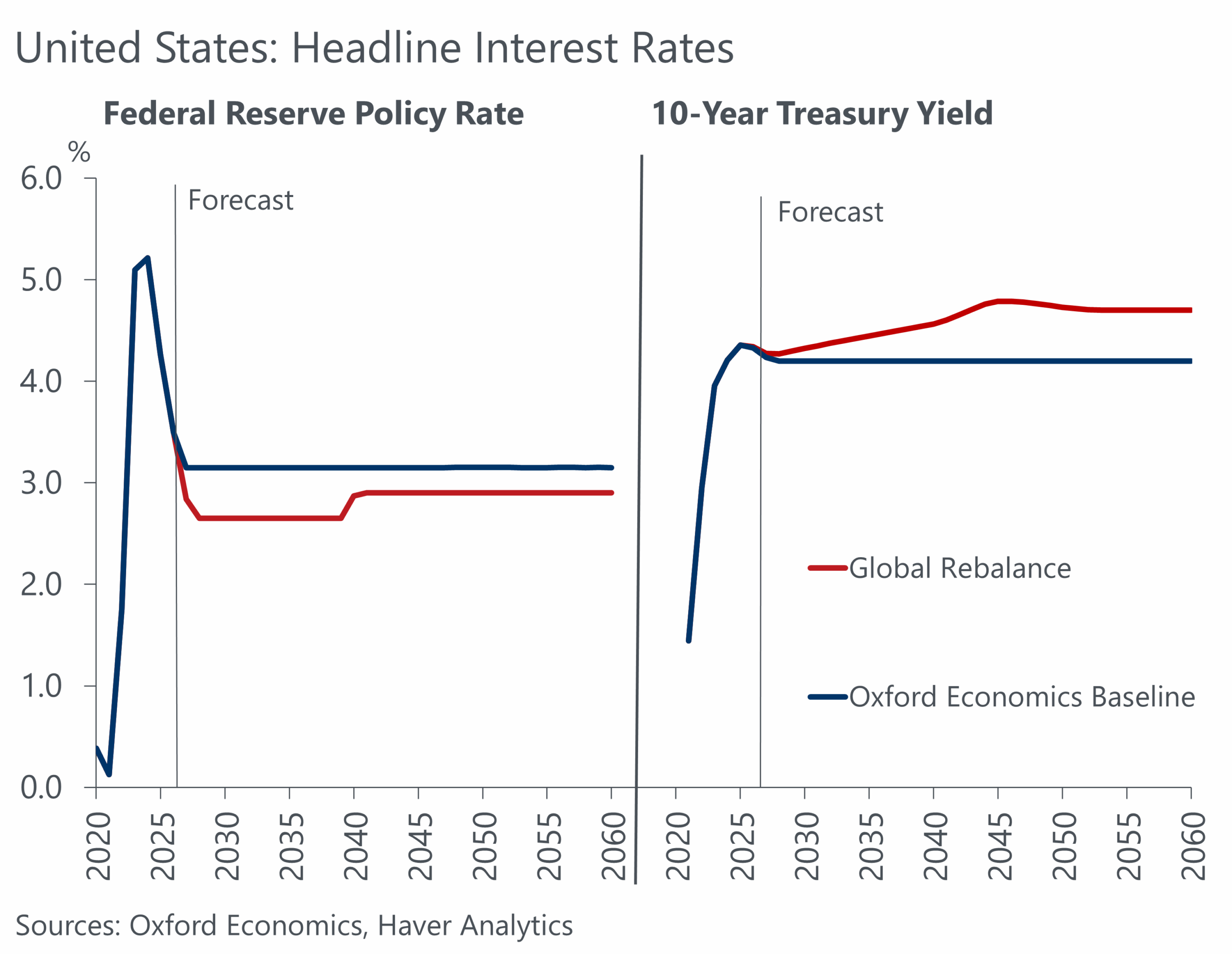 Against this backdrop, long-run structural risks are rising. Our Megatrends Scenarios service offers a framework for quantifying these risks. In our Global Rebalance scenario we quantify how sustained shifts in policymaking from the big global powers could reshape the economic and financial order out to 2060.