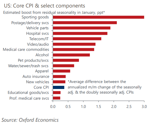 - Residual seasonality contributes 3bps to the m/m change in the core CPI in January. This effect is even larger in the core PCE deflator, the Federal Reserve’s preferred inflation gauge.