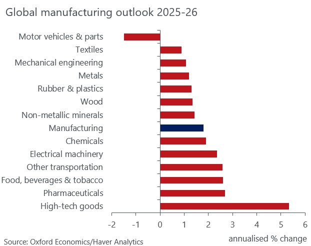 Despite the weak industrial picture, some elements of US industry remain resilient with solid demand for electronics, driven by demand for computing power from AI and data centres. The fact that semiconductors and are exempt from tariffs—at least for now—will help curb the inflationary pressure on imported inputs. Recent investments—driven by the CHIPS Act—have raised the sector’s domestic productive capacity. More domestic-oriented sectors, such as food and beverage, will also be among the strongest growing sectors in the US.