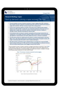The post-pandemic recovery in business investment in Japan is lagging other GDP contributors. But we expect the pent-up demand accumulated during the Covid crisis, boosted by the easing of supply-side constraints, will lead a recovery in capex in the coming quarters.