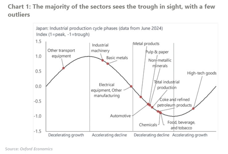 - Output of high-tech goods has been growing since the beginning of 2024 largely thanks to higher semiconductor production, notably bucking the downward trend across much of industry. We see momentum only strengthening from here, and at 4.1% growth for 2024, the industry is forecast to be one of the fastest-growing manufacturing sectors this year.