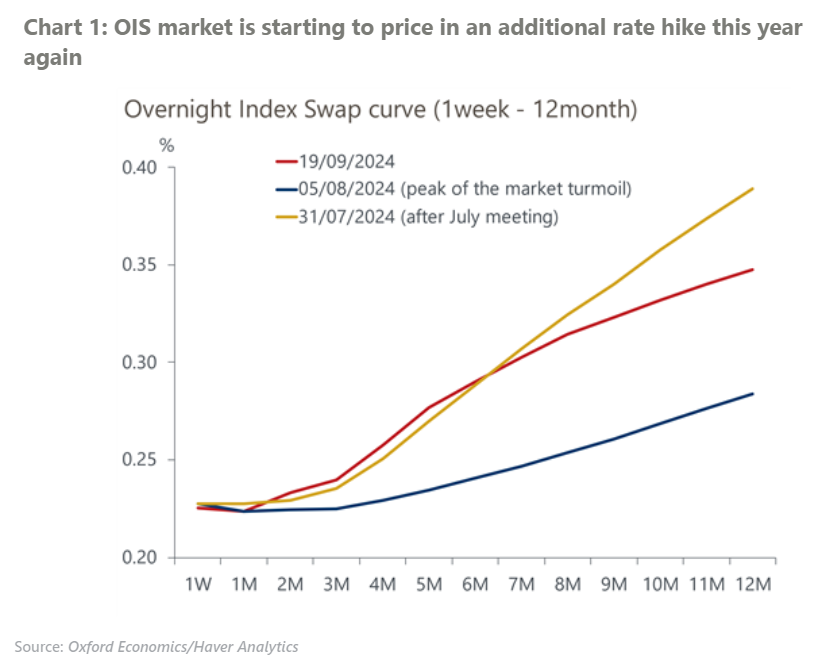 - Financial markets are still jittery but are gradually calming down following a period of heightened volatility in early August. As financial markets calm down, the bond market is again pricing in an additional rate hike by the BoJ within this year, backed by recent hawkish comments from BoJ officials.