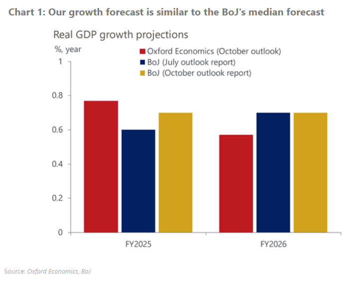 The Bank of Japan (BoJ) kept its policy rate at 0.5% at its October meeting, after a 7-2 majority vote. Two board members again voted for a rate increase. We believe the BoJ will hike in December to 0.75% as incoming data confirm that the economy is performing in line with the bank’s forecasts in its quarterly outlook. However, there’s a material chance of a delay.