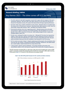 The 2023 outlook for the Gulf Cooperation Council (GCC) region will not compare to this year’s spectacular expansion. That said, GDP in the region will grow at more than twice the pace we forecast for the global economy. We explore five themes that will shape regional performance.
