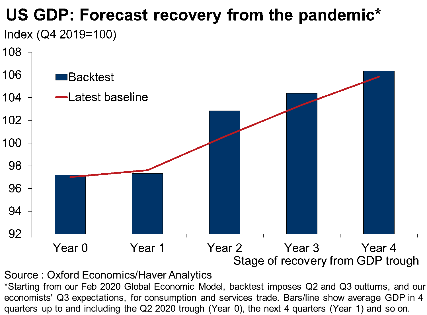 The starting point in the back-testing exercise was our Global Economic Model in February, during the early stages of the pandemic. We then imposed in our model the actual outturns in Q1 and Q2 2020 for consumption and services trade – two of the areas most directly affected by public health restrictions – and our economists’ expectations of the Q3 2020 outturns for these variables prior to their official release.